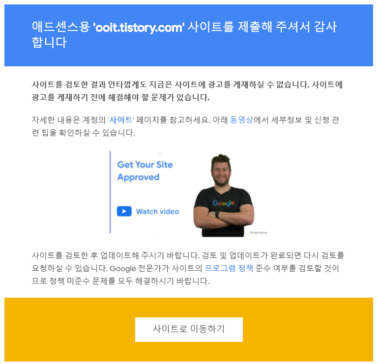그런데 그런 걱정도 잠시 구글은 확실하게 단칼에 거절메일을 보내주셨습니다. ㅠ