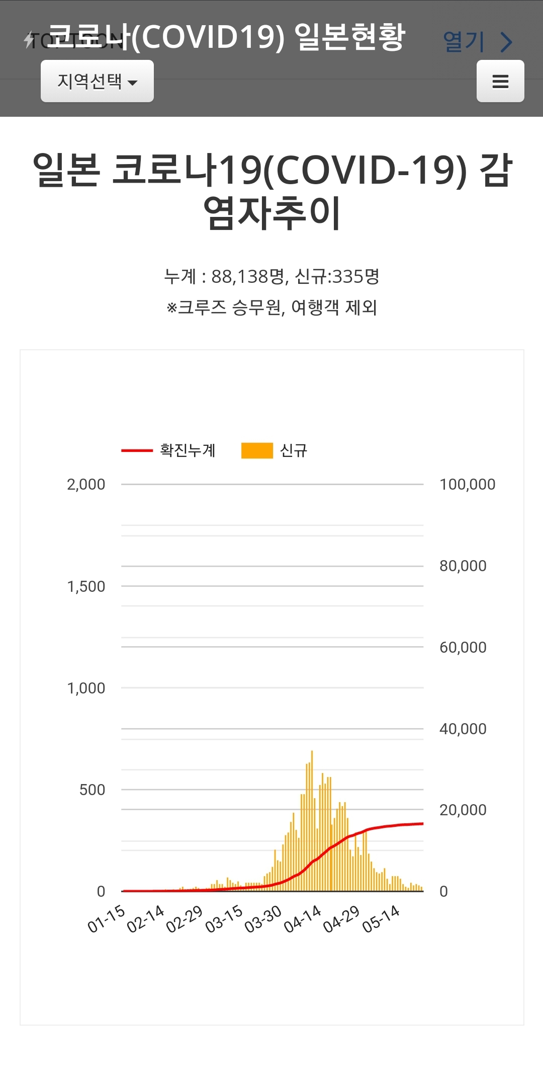 일본에서도 지역별 확진자나 누적 확진자, 일자별 신규 확진자 등의 정보를 제공하고 있었습니다.