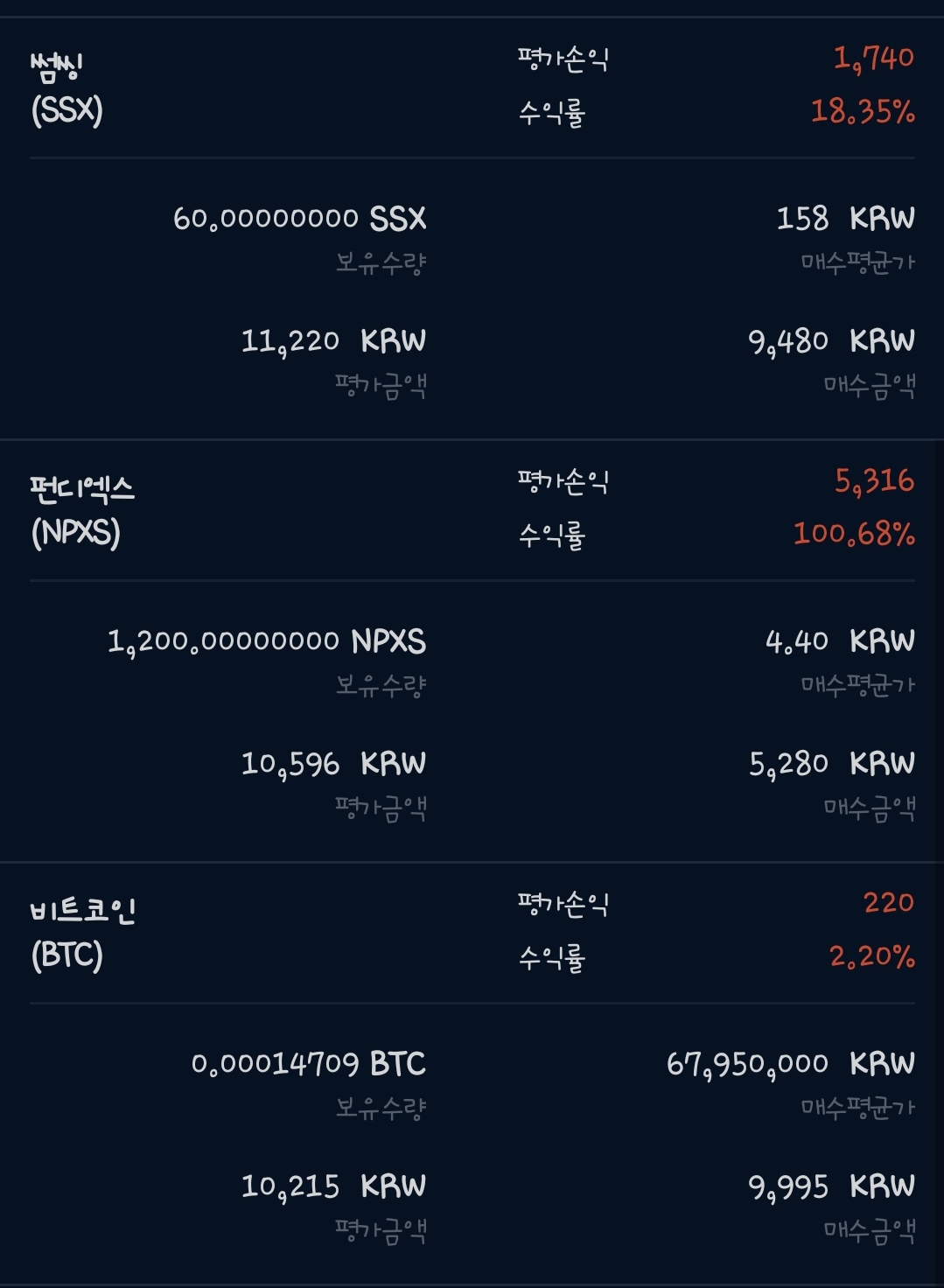 보유하고 있는 코인은 비트코인이 1만원, 썸씽 1만원, 펀디엑스 5천원이다. 비트코인은 상승폭이 더디고, 썸씽은 보통, 펀디엑스는 솟아올랐다. 주변사람들의 추천으로 구매하게 되었는데 포트폴리오를 바꿀지는 좀 고민이 된다.