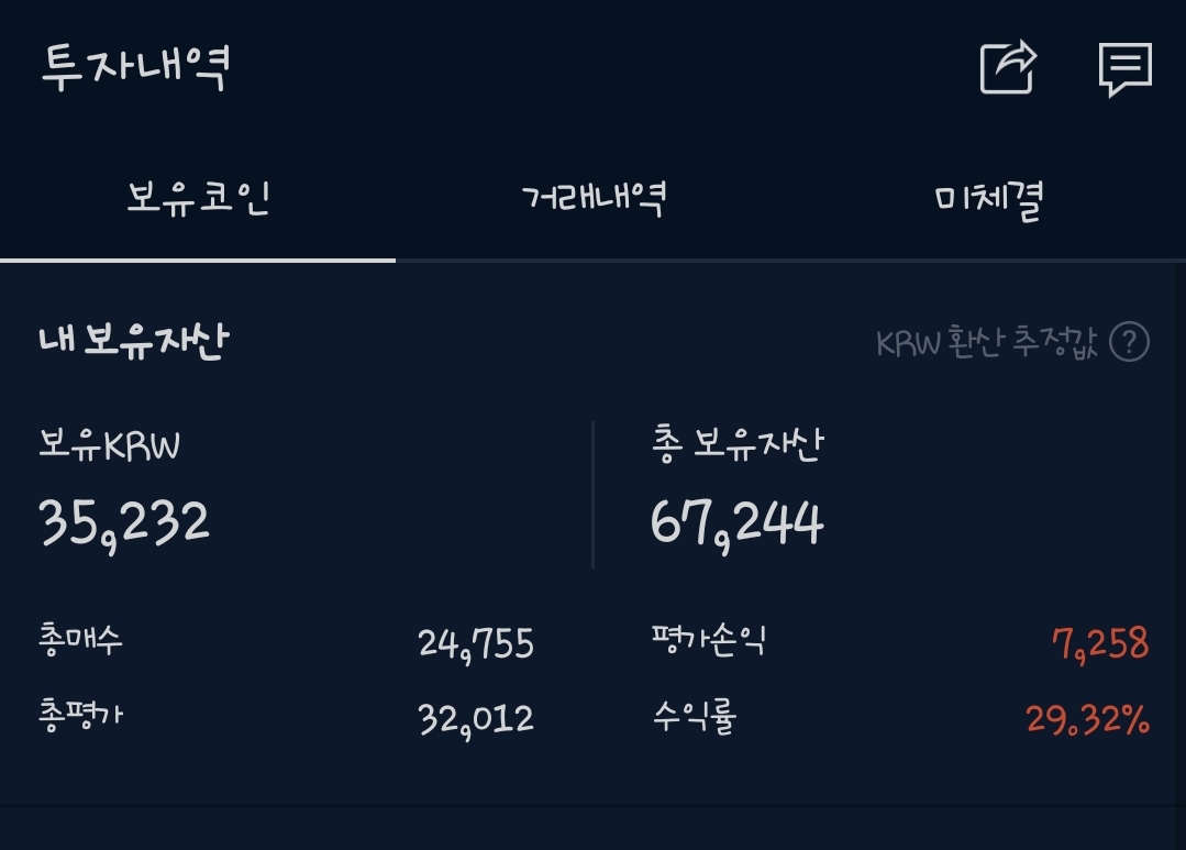 나의 경우 아주 귀여운 돈으로 투자를 시작했다. 총 2만5천원 가량의 돈이 들어가있는데.. 지금 수익률이 30퍼센트정도로 7000원 정도의 이익이 생긴상태이다. 아직 매도를 안했기에 머..번돈은 아직 없다.