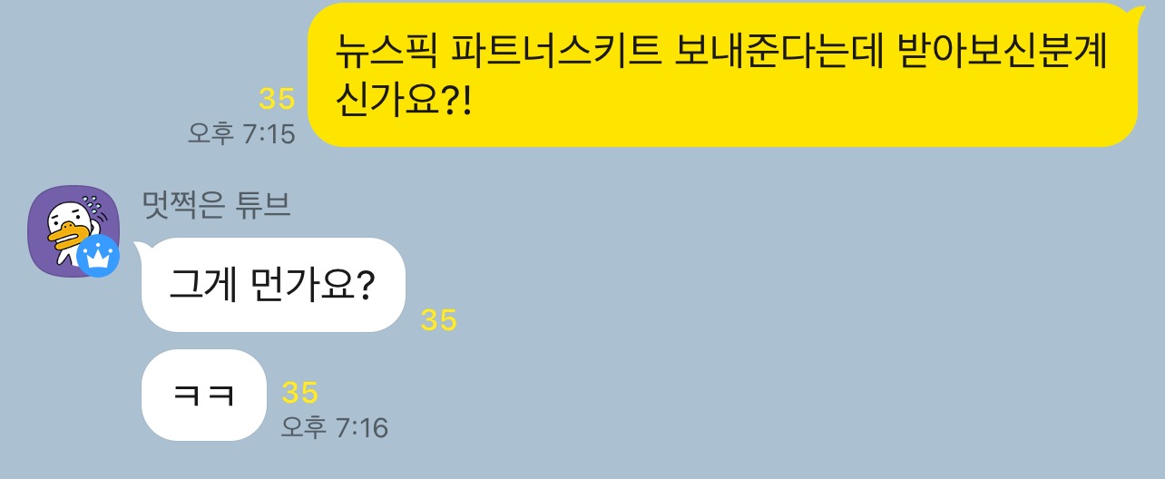 짜잔!!! 뉴스픽 파트너스 키트라고 해서 뉴스픽 하는 사람들은 다 받은건가 싶었는데 그런건 또 아닌가 보다. 같이 정보 주고받는 분들 톡방에 물어보니 처음들어보시는 것 같다.