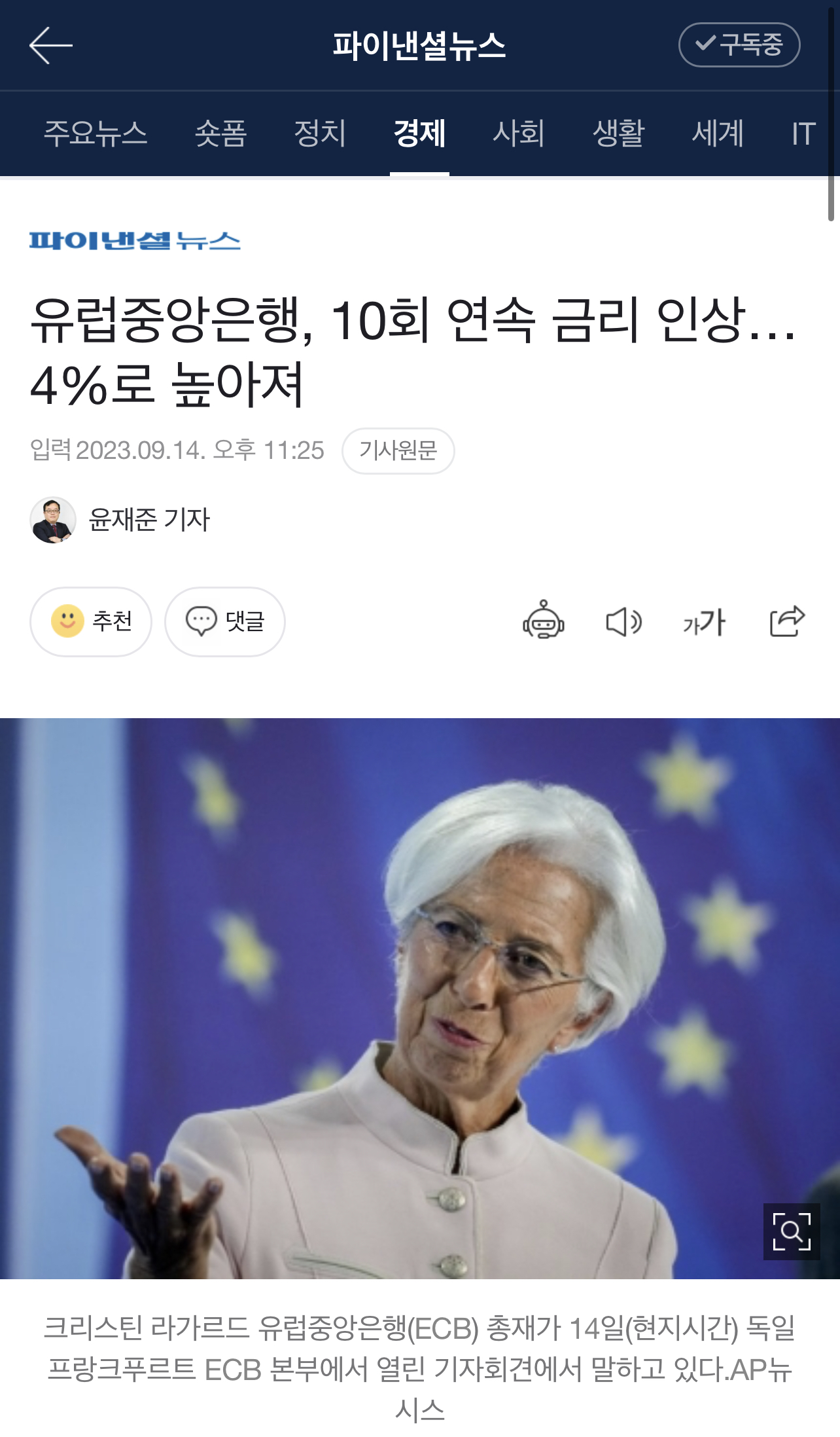 유럽중앙은행(ECB)이 10회 연속으로 금리를 인상하여 이제 금리가 4%로 높아진다는 소식에 대한 의견을 나눠보려고 합니다. 이러한 결정은 유럽과 글로벌 경제에 미치는 영향을 고려할 필요가 있습니다.