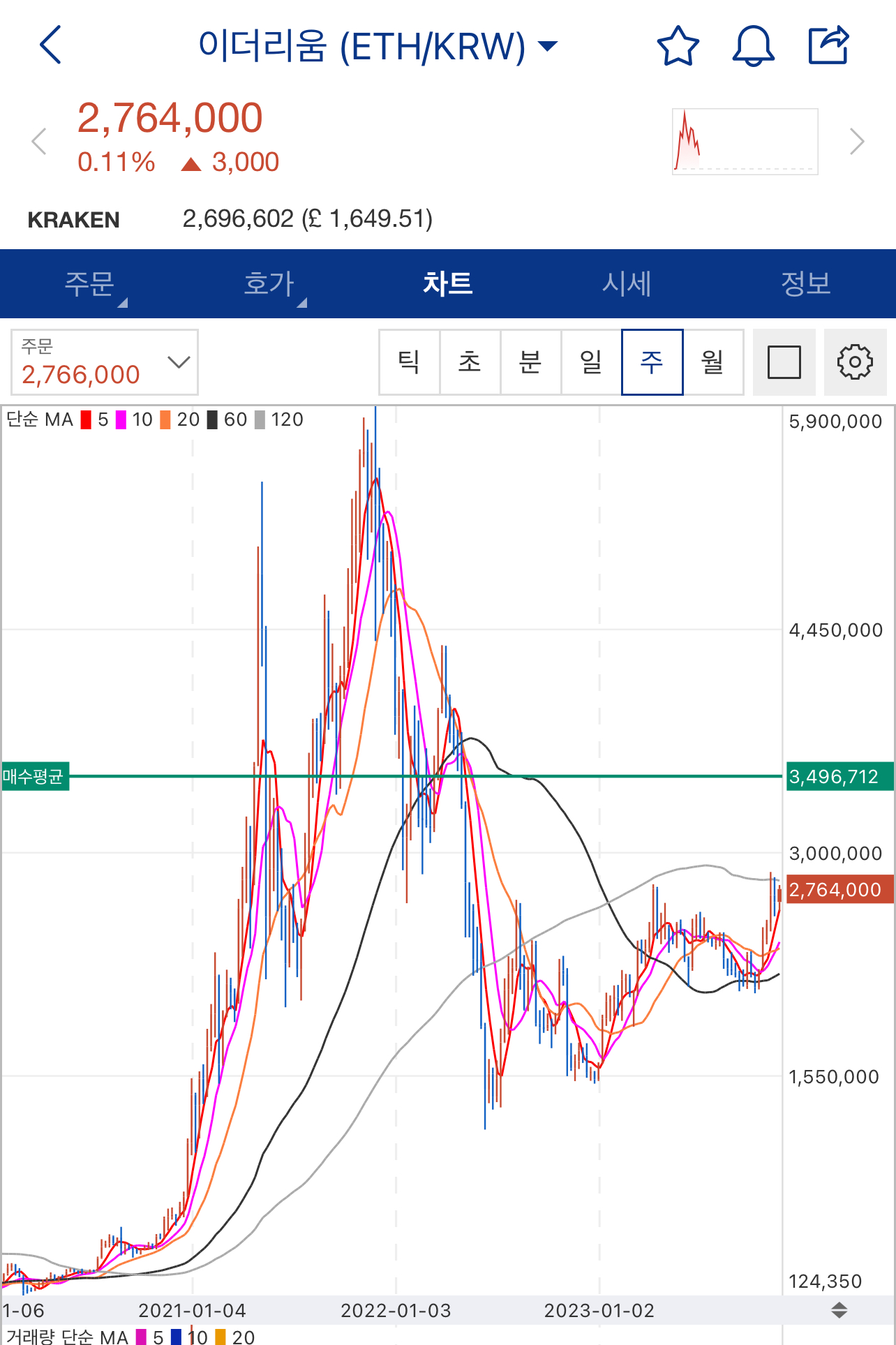 이더리움의 최고단가는 600만원이었고, 150만원대까지 내려갔다가 지금은 276만원대이다. 내가 소유하고 있는 이더리움의 단가는 350만원대이다. (참고로 쪼금 물타서 이정도.. ㅋㅋ)