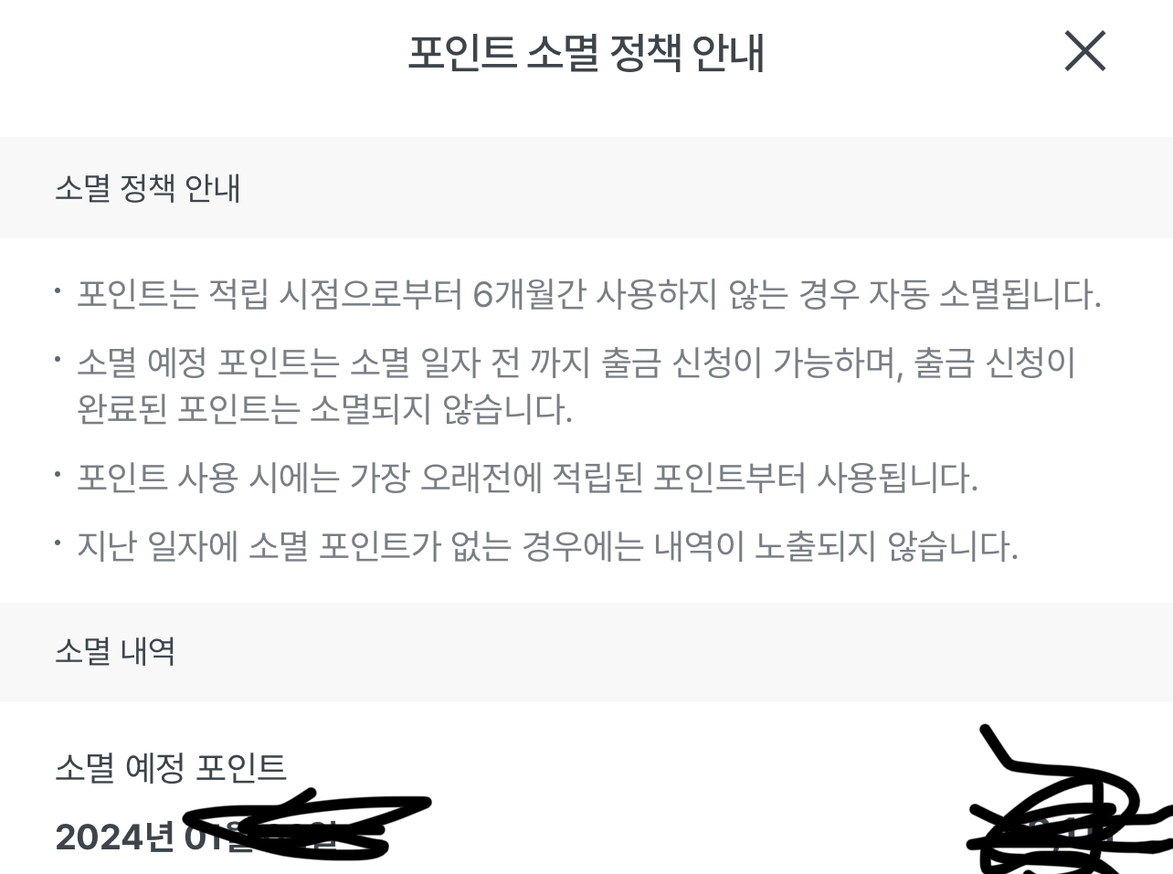 출금은 5만원이 출금가능 최소 금액인데... 6개월간 5만원을 못채우면 포인트는 날아가는 겁니다 ㅠㅠ 제 소즁한 2000원가량도 24년 1월에 소멸예정...