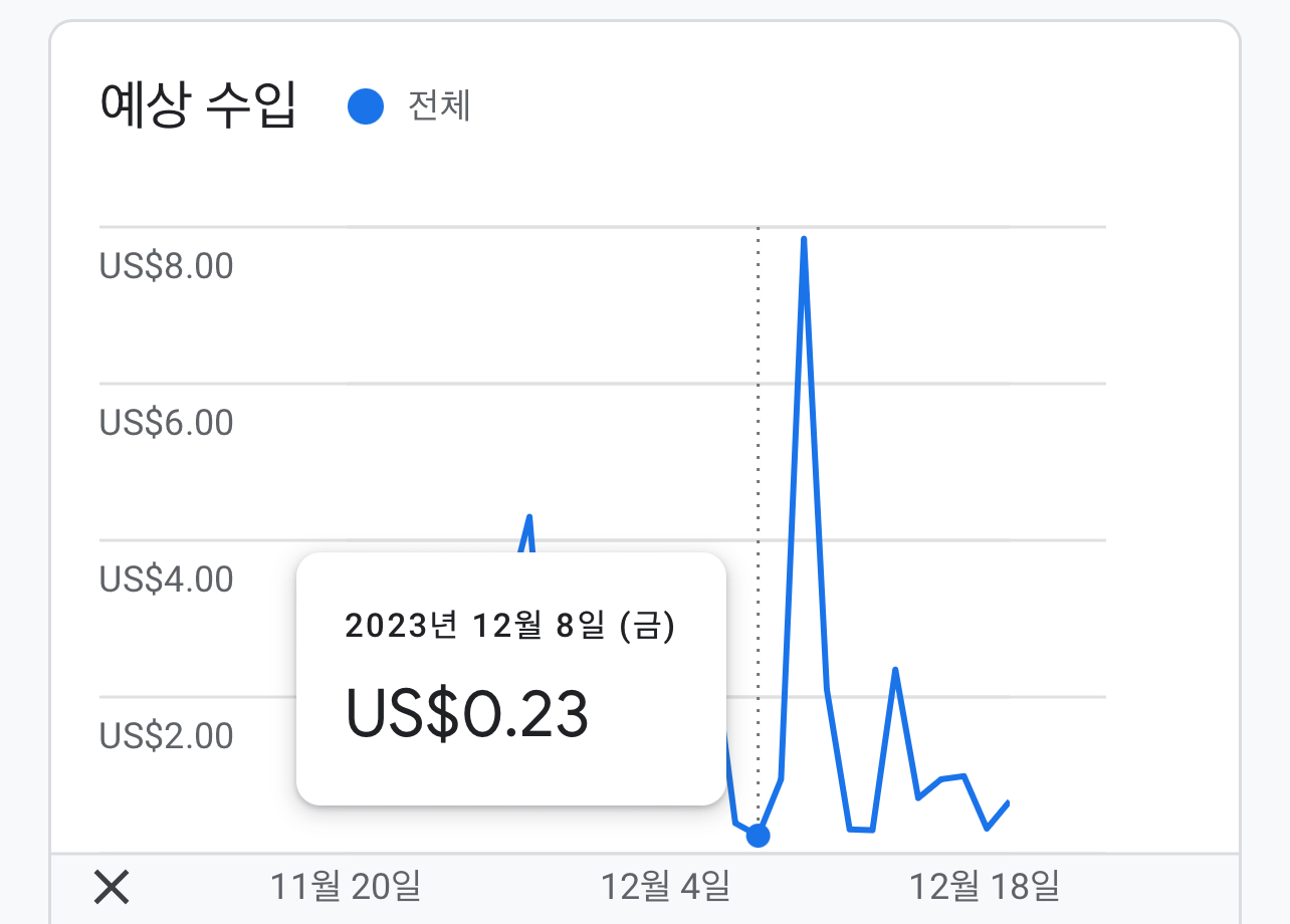 오늘은 지난 30일간 블로그의 수익이 얼마나 되었는지 돌아보려고 하는데,, 가장 낮았을때 수익을 보니 0.23달러네. 대략 2-300원 정도라고 보면 되겠다.